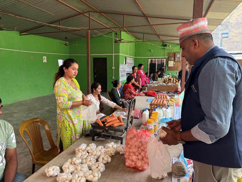 मेलामा लोकल दाल, चामल,गेडागुडी,तेल,मसला,बेसार,तयारी खाजा, भुटेको मकै,तरकारीका सुकुटी लगायतका उपभोग्य वस्तुहरु राखिएका छन् । त्यस्तै च्याउ, गाजर लगायत ताजा हरियो तरकारी, दुग्धजन्य पदार्थमा दूध, दही, घ्यू, पनिर, मही, ढाकाको कपडा,अण्डा,कुखुरा तथा स्थानीय मासुजन्य परिकारहरु लगायतका सामग्री पनि बिक्रीका लागि राखिएको आचार्यले बताउनुभयो ।