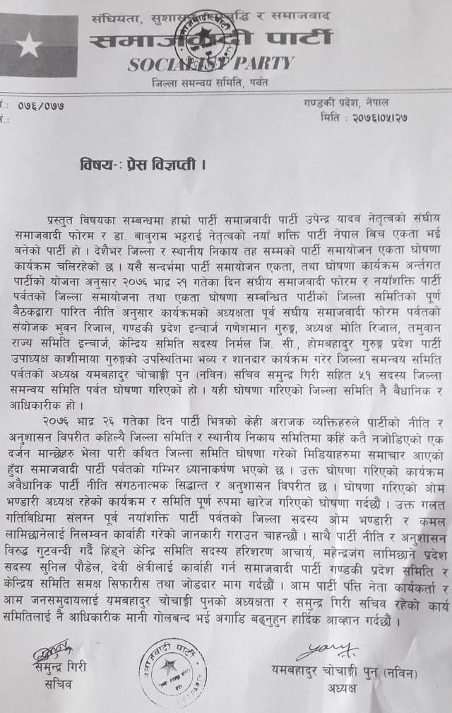 विज्ञप्तीमा २०७६ साल भाद्र २१ गते बनेको यामबहादुर चोचाङ्गी पुन अध्यक्ष र समुन्द्र गिरी सचिब रहेको कार्यसमिति नै आधिकारीक भएको भन्दै भ्रममा नपर्न आग्रह गरिएको छ ।
