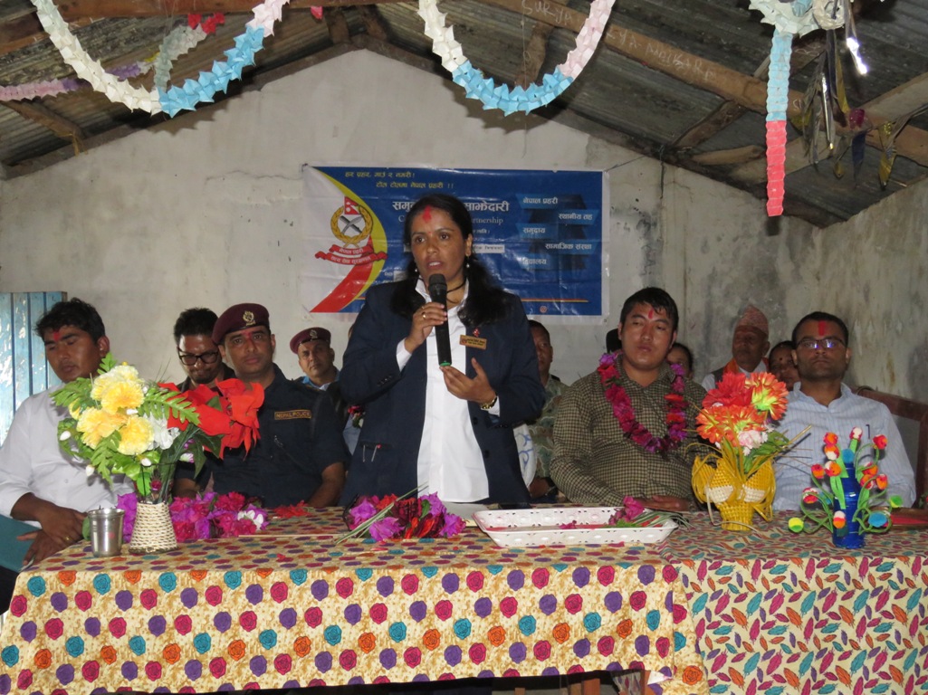 जिल्ला प्रहरी कार्यालय पर्वतको आयोजना र वडा नं. ५ लुंखुदेउरालीको संयोजनमा कार्यक्रम सम्पन्न भएको हो । सो अवसरमा बोल्दै प्रमुख जिल्ला अधिकारी कल्पना घिमीरे नेपालले एकीकृत सुरक्षा योजना बनाएर शान्ति सुरक्षालाई मजुबुत बनाईएको र विकास निर्माणका कार्यलाई पनि विनाअवरोध सम्पन्न गर्न पहल गरिएको बताउनुभयो ।