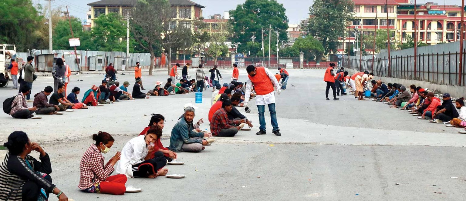 एक–दुई जना गर्दै खाना खान आउनेहरूको संख्या केही मिनेटमा नै गन्नै मुस्किल पर्छ । त्यत्तिकैमा खानासहितको एउटा गाडी वीर अस्पतालको गेट तर्फबाट भित्र पस्छ । भोको पेट भर्न आएकाहरू गाडी चिन्छन् र आफूले लगाएका चप्पल खोलेर लाइन लागेर भुइँमा बस्छन् । हरियो ज्याकेट लगाएका युवाहरू कागजका प्लेट तथा कप बाँड्न थाल्छन् । खाना बाँड्न सुरु हुन्छ । मान्छे थपिएको थपियै छन् ।