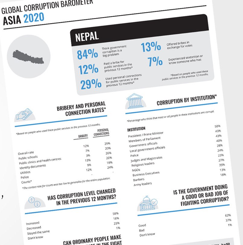 नेपालका ८४ प्रतिशत जनताले भ्रष्टाचार ठूलो समस्या रहेको सोच्ने गरेको पनि प्रतिवेदनले उल्लेख गरेको छ । त्यस्तै, १२ प्रतिशत जनताले एक वर्षमा सार्वजनिक सेवा लिँदा कुनै न कुनै रूपमा घुस खुवाउनुपरेको पनि उल्लेख गरेका छन् ।