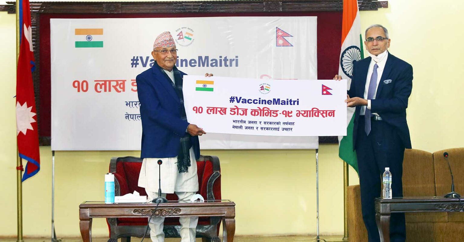 काठमाडौं – भारतले अनुदानमा उपलब्ध गराएको कोभिड– १९ विरुद्धको १० लाख डोज ‘कोभिसिल्ड’ खोप काठमाडौं आइपुगेको छ । बिहीबार अन्तर्राष्ट्रिय विमानस्थलमा नेपालस्थित भारतीय राजदूत विनयमोहन क्वात्राले स्वास्थ्यमन्त्री हृदयेश त्रिपाठीलाई खोप हस्तान्तरण गरेका छन् ।