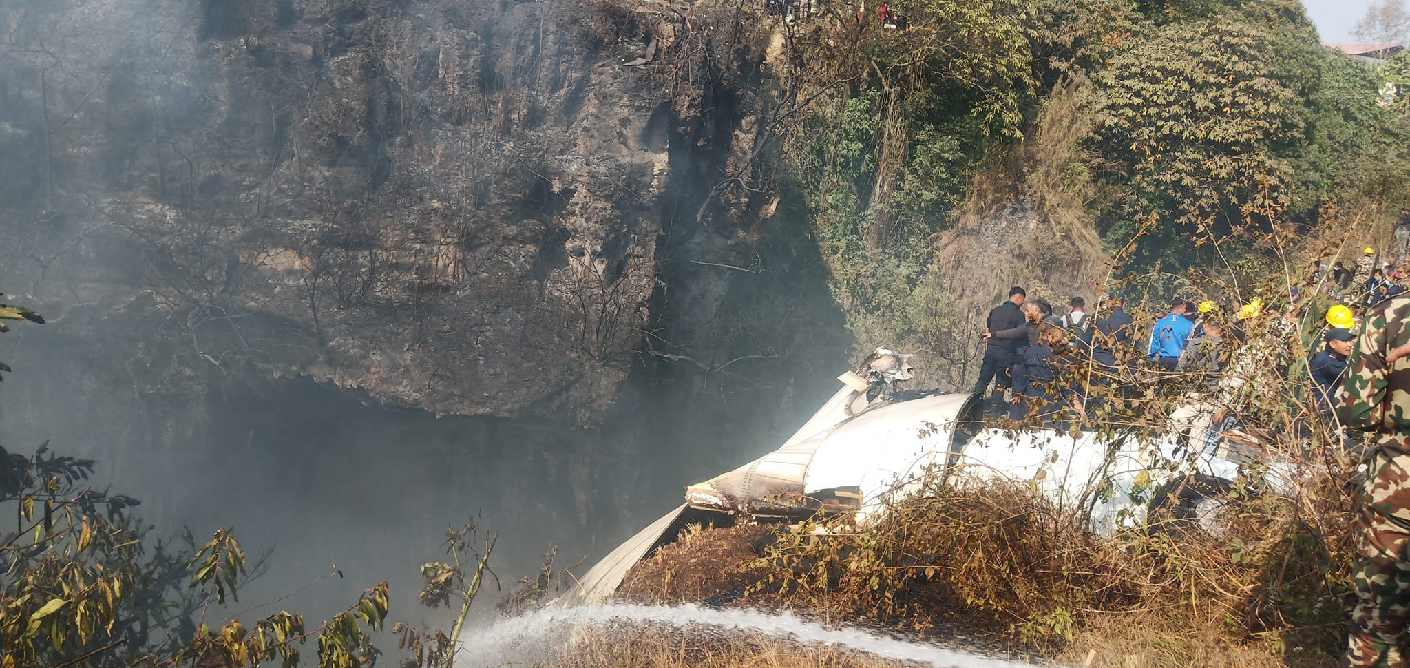 जहाज दुर्घटनामा मृत्यु भएका यात्रुको शव डोरीको माध्यमले सेती खोचबाट निकाल्दै सुरक्षाकर्मी । तस्बिर सौजन्य : मौसम जीसी