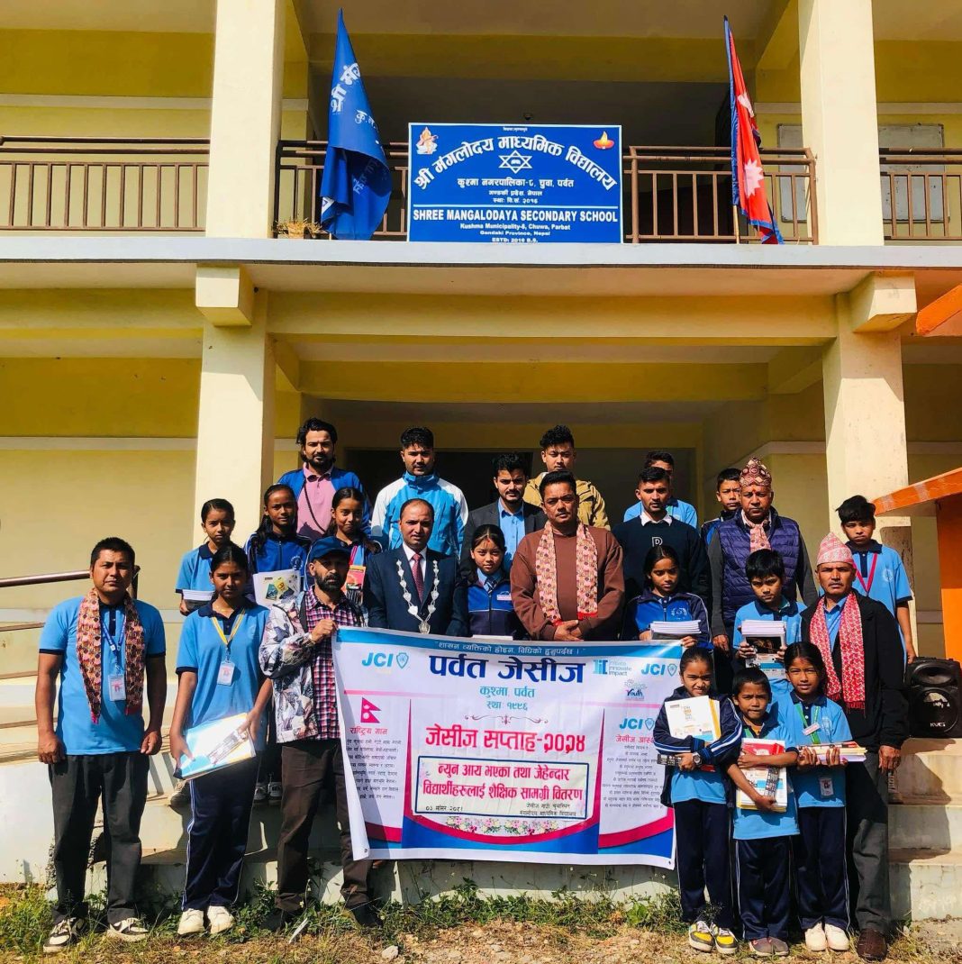 पर्वत : पर्वत जेसीजले मनाइरहेको जेसीज सप्ताह–२०२४ अन्तर्गत सोमबार जेसीज गाऊँ चुवास्थित मंगलोदय माध्यमिक विद्यालयका गरिब तथा जेहेन्दार बिद्यार्थीहरुलाई शैक्षिक सामग्री वितरण गरिएको छ ।