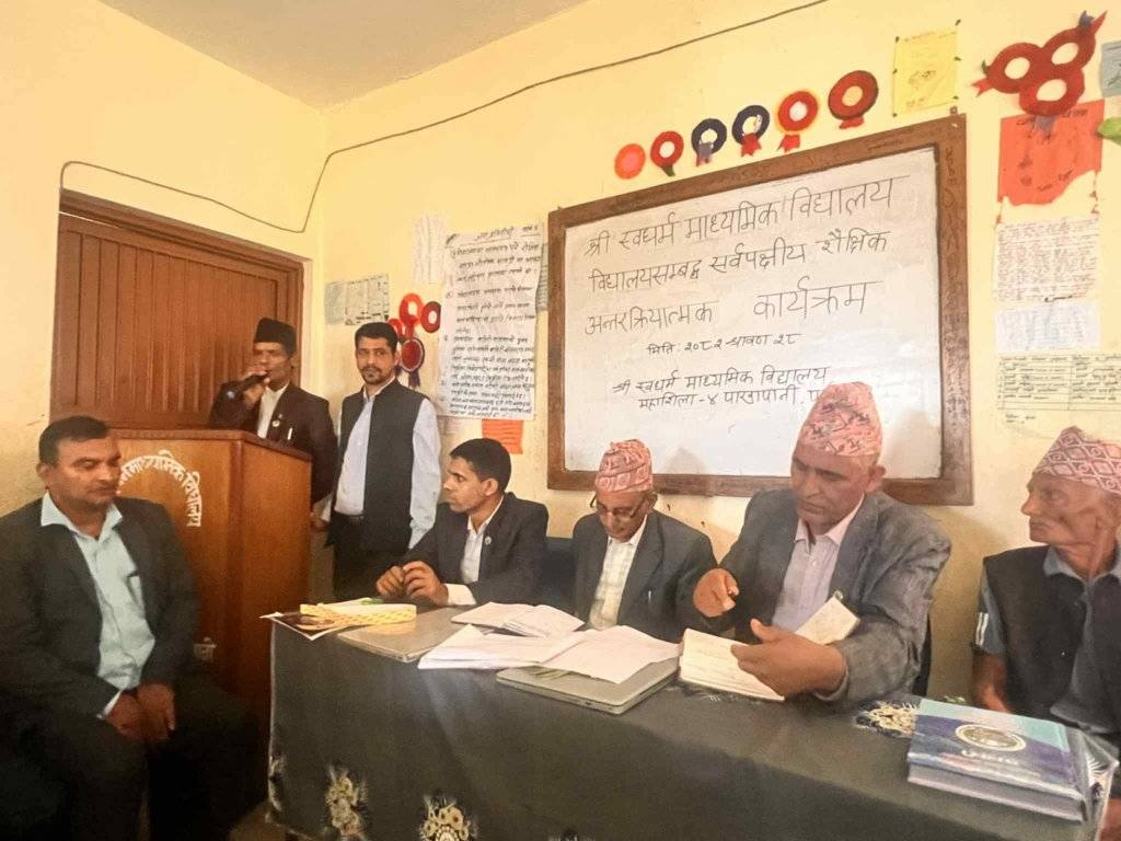 पर्वत – स्वधर्म माध्यमिक विद्यालय महाशिला-४ पाखापानी पर्वतमा विद्यालयसम्बद्ध जनप्रतिनिधि, वि.व्य.स. शिक्षक अभिभावक सङ्घ ,शिक्षक, अभिभावक, र विद्यार्थीहरूको सर्वपक्षीय शैक्षिक अन्तरक्रियात्मक कार्यक्रम सम्पन्न भएको छ।