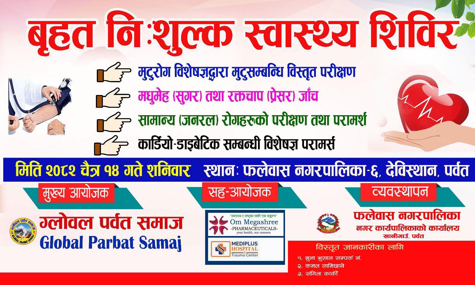 पर्वत — फलेवास नगरपालिकाको देविस्थानमा एक दिने बृहत् निःशुल्क स्वास्थ्य शिविर आयोजना हुने भएको छ। “ग्लोबल पर्वत समाज”को मुख्य आयोजनामा सञ्चालन हुन लागेको उक्त शिविर आगामी २०८२ चैत १४ गते शनिबार आयोजना गरिने जनाइएको छ।